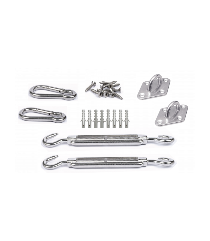KIT 2 FIXATIONS VOILE D'OMBRAGE INOX TENDEURS + MOUSQUETONS + PONTETS + VIS & CHEVILLES