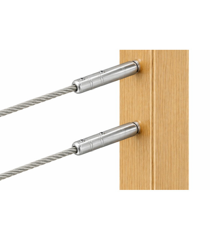 Ce tendeur en inox A4 (AISI 316) est conçu pour la mise en tension de câbles inox de 3 mm ou 4 mm. Il est équipé d’un filetage bois M6x90 mm pour une fixation solide sur support bois et livré avec écrous, rondelles et cheville.