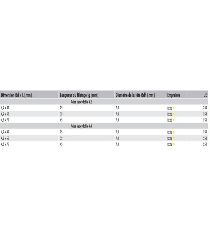 | 4,2 x 56 mm | TX20 | 7,6 mm | Partiel 30 mm |